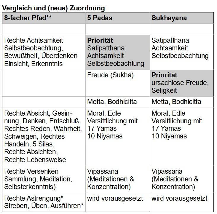 Die beste Zusammenfassung der praktischen Umsetzung der Lehre Buddhas ist eben in den 5 Padas (Pfeiler der Bemühung) gegeben, die eine parallelle, gleichtgeschaltete Praxis ist. Alle Padas sind in allen Lebensumständen und Tagesabläufen praktizierbar, egal ob Mönch oder Laie. Die 5 Padas machen keine Unterscheidung zwischen wenig, mittel oder gut befähigten Schülern !